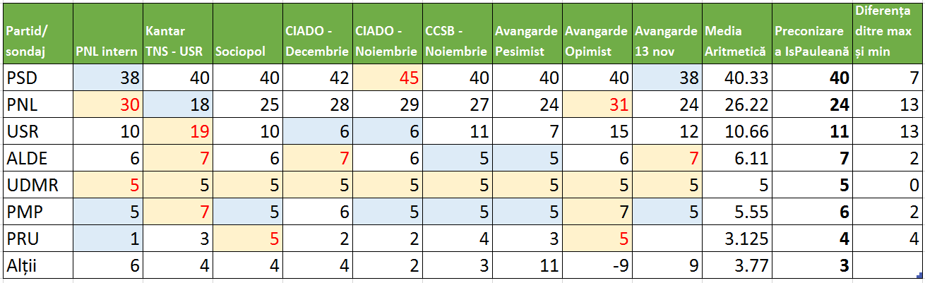 Cifrele pe fond albastru reprezintă minimul obținut de acel partid. Cele scrise cu roșu și pe fond ușor portocaliu reprezintă maximul primit de către partidul în discuție. Coloana ”Media aritmetică” reprezintă fix asta, media aritmetică a tuturor rezultatelor obținute de fiecare partid, mi-am permis să dau și o preconizare personală, iar ultima coloană reprezintă variația, respectiv diferența dintre procente, max si min, primite de acel partid.