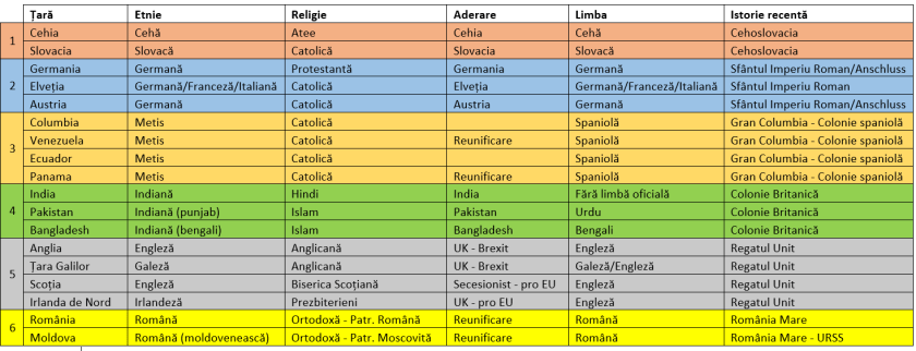 V-ați întrebat de ce primele trei au steagul foarte asemănător? Nu, nu e ca să vă enerveze pe voi la geografia lumii, ci pentru că ele au fost un singur stat, ”Gran Columbia”, condus de marele Bolivar (care era mic de statură, dar nu contează). Gran Columbia s-a divizat în aceste patru țări, plus încă niște teritorii pe la altele, pe la 1831. Toată lumea vorbește spaniolă. Au același grup etnic majoritar – metișii americii latine (și Bolivar era la fel). Au aceeași religie majoritară, catolicismul. Regiunea a fost unită în lupta pentru independența față de Spania, dar loviturile de stat ulterioare anului 1830 și instabilitatea politică a făcut ca aceste regiuni să se dividă și mai tare, ajungând să fie state independente. Actualmente se tot vorbește despre o potențială unire, discuții pornite de Venezuela și Panama.