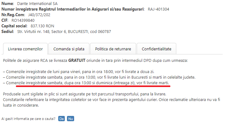Și acum vă întreb eu. Dacă n-aveam imprimantă să scot ce-mi dăduseră pe mail, sau vreo formă electronică de prezentare a asigurării, și eram dependent de livrarea marți a poliței și luam decizia în baza reclamei puse pe site cu livrarea, nu era o formă de încălcare a articolului 4 din legea 158/2008? Cum ce zice articolul? Simplu: publicitatea înșelătoare este interzisă.