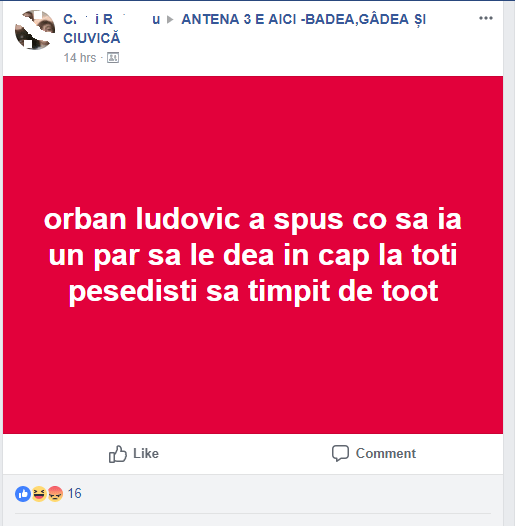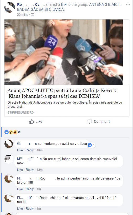 – Principalele surse media online pe care le vehiculează cei din acest grup sunt știripesurse.ro, sokant.ro și ro.sputnik.md. Nu, antena3.ro nici măcar nu intră în această categorie. Ba cred că mai multe articole adevărul.ro pot fi văzute pe acest grup pentru că invită la ură față de tema propusă.