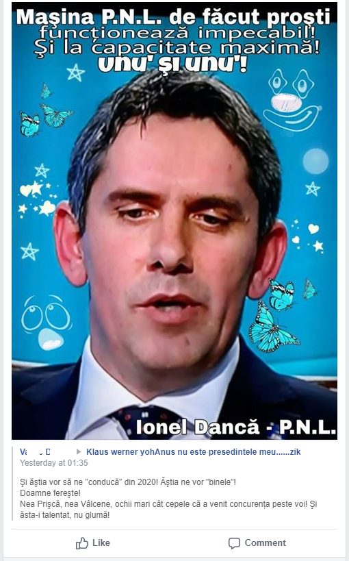 – Membrii grupului ăstuia îl consideră pe Ionel Dancă drept foarte prost. Dancă e purtătorul de cuvânt al PNL și participă destul de des la emisiunile Antenei 3. Este și normal ca un contestatar să fie desconsiderat. Dar Dancă e ceva special în ochii lor. Cam cum e Codrin în ochii oamenilor normali. Dancă e cel căruia Gâdea i-a urat s-o pupe în cur pe Kovesi.