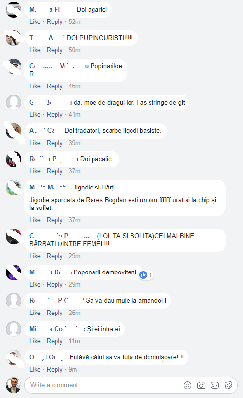 – Oamenii din grupul ăsta sunt super homofobi. Dar nu își dau seama că urarea de a întreține acte sexuale cu un bărbat, venite din partea unui alt bărbat, nu e homofob cât e fix inversul. De exemplu, urmăriți comentariile puse la o poză cu Emil Hurezeanu și Rareș Bogdan.