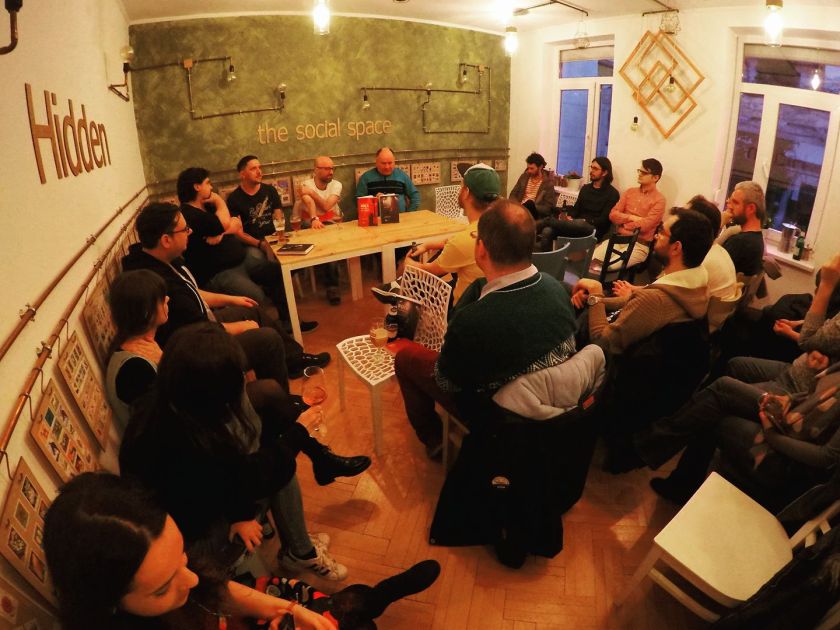 Discuția a întârziat mai bine de jumătate de oră, timp în care ochii întrebau simplu ”unde e Artan?”. Nu e Artan, așa că organizatorii au anunțat oficial ”dispariția sa pe undeva prin Belgia”, și am început conversația cu cei patru. Andrei Ruse (editorul cărții și moderatorul), Mihnea, Dan și Nelu. Toate glumele au fost puse pe seama lui Mihnea, poreclit ”Artan” pe perioada discuțiilor. Sorbind din beri nu am putut să nu remarc că Nelu Stratone se bucura de un Csiki Sor. Probabil e Soroșist ascuns iar această antologie e făcută să manipuleze. Nu știu?! Ceilalți au fost tratați destul de respectabil, ca niște veritabili iluștri ai rockului românesc, cu bere în pahare. Până la urmă totul se schimbă, se trece de la berea din sticlă la pahar, de la cea de consum larg la artizanală, de la pop-rock la ceea ce acum se cheamă post-rock, post-metal. De la un public învățat să-și idolatrizeze formațiile, la literalmente prieteni ai acesteia. Și cam asta a fost, până la urmă, tema discuției, și este și tema cărții, anume schimbările pe care le-au adus anii 90 în rockul românesc.