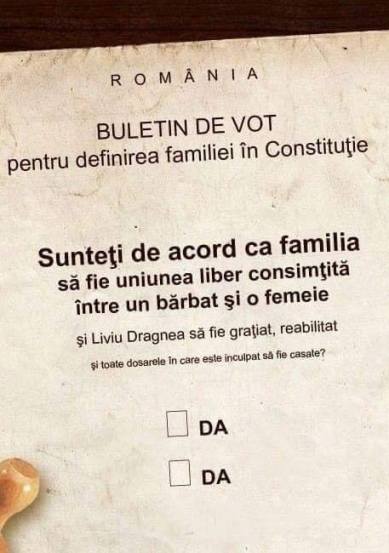 Deci, să ne intre bine în cap: la referendum se votează un singur lucru – schimbarea ”între soți” cu ”dintre un bărbat și o femeie”. Și atât. Ești de acord, votezi da, nu ești de acord, votezi nu. Sau boicot. Tu știi.