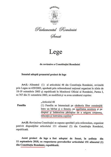 Articolul unu zice ce se modifică și unde. Se face trimitere la articolul 48 din Constituție, alin 1: ”familia se întemeiază prin căsătoria liber consimțită dintre un bărbat și o femeie, pe egalitatea acestora și pe dreptul și îndatorirea părinților de a asigura creșterea, educația și instruirea copiilor”. Până în prezent, textul suna așa: ”Familia se întemeiază pe căsătoria liber consimțită între soți, pe egalitatea acestora şi pe dreptul şi îndatorirea părinților de a asigura creșterea, educația şi instruirea copiilor.” Deci este o singură diferență: ”liber consimțită între soți” versus ”liber consimțită dintre un bărbat și o femeie”.